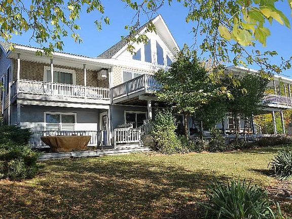 Enjoy a spacious year round lake front home on the northeast end of Lake George. This has easy year round access with a southern exposure including panoramic lake and mountain views. There is 100 feet of level, tie line lake front with a portable docking system. The first floor has a master bedroom with a private deck, walk-in closet and master bath. There is a cathedral ceiling living room with a gas stove on a tiled hearth, family room, den, eat-in kitchen, formal dining room, laundry/pantry, and 2 more full baths on this level with an extensive wrap-around covered porch outside. Overlooking the first floor is a nice sized loft. The bottom level is an in-law apartment. There is a kitchen, dining and den area with a gas stove on a brick and tiled hearth. It also includes 4 more bedrooms & 2 1/2 bathrooms. A patio is off the west end of the house & on the lake side. A circular drive leads to a detached 3 bay garage and a storage building.