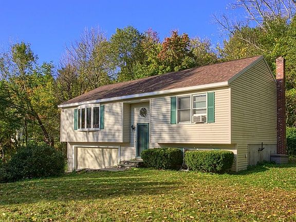 OPEN HOUSE SUNDAY 1:30-3:30. Country road leads you home to this Hubbardston raised ranch. Located on picturesque Mount Jefferson Road with walking distance to Mt. Jefferson conversation area. Generous first floor living space with cathedral ceilings in both living room and kitchen gives the home and open spacious feeling. Freshly painted throughout with modern paint selections is warm and inviting. Loads of cabinet space in spacious kitchen along with breakfast bar and separate seating area. Lower level is finished and currently is used as a family room w/separate office nook OR create a 3rd bedroom if needed, adds additional 500 +/- square feet to home. Garage under allows for a place to store all the extras! Nice corner lot with trees surrounding yard for privacy. Home is wired for generator. A great starter home or downsize alternative in convenient Hubbardston location.