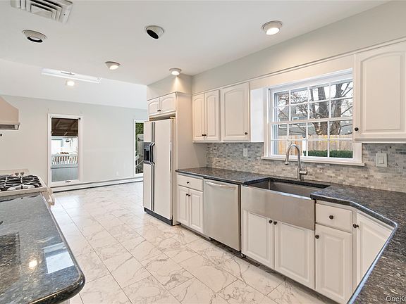 Just steps from a private beach, this stunning brick ranch at 9 Oak Shore Drive in Bayville offers quintessential Sound-side living. With three bedrooms and 2.5 baths, the home’s open layout and hardwood floors create an inviting, sunlit atmosphere. The spacious living room, complete with skylights and a gas-burning fireplace, flows to a large eat-in kitchen with tile floors and sliding glass doors that open to a backyard deck—perfect for quick walks to the sand or watching evening sunsets over the water. A recently updated half bath and a main-level full bath with a deep soaking tub and separate shower add modern comfort. The fully finished basement includes a renovated full bath, laundry room, boiler room and exterior egress. Outdoor amenities feature a swimming pool and pool house with a half bath and storage, plus a one-car garage. Embrace a rare opportunity to live just steps from your private beach.