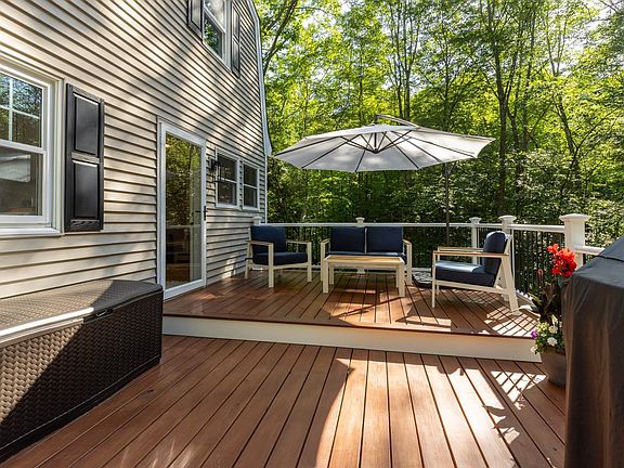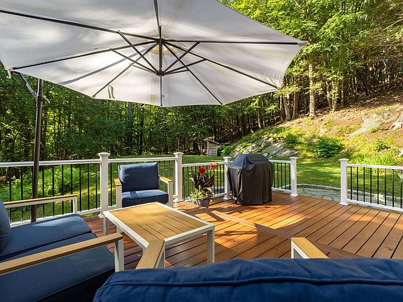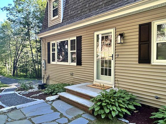 Set on 5 private, wooded acres in sought-after Newfields, NH, this thoughtfully refreshed 3-bedroom, 3-bath Gambrel-style home seamlessly blends timeless charm and functionality. Recent updates include bathrooms, appliances, flooring, windows, and a stunning, expansive deck overlooking beautifully landscaped grounds. Inside, the bright and cozy living room invites you to relax, while the eat-in kitchen features newer appliances and opens to a versatile space that can be used as a formal dining area or a comfortable home office. The layout offers both openness and privacy, with natural light bringing the outdoors in. Upstairs, the primary suite is a peaceful escape with its own stylishly renovated bath, while two additional bedrooms feature built-ins, nooks, and smart storage details that add character and function. A walkout basement with a wood stove provides abundant storage or future finishing. Step outside onto the two-tiered deck—ideal for entertaining or simply relaxing in complete privacy. Flowering perennials, stone patios, mature trees and rugged ledges create a peaceful natural retreat. Whether you’re sipping morning coffee on the deck or enjoying quiet evenings under the stars, this property offers a rare combination of rural charm, comfort, and convenience—just minutes from local trails, commuter routes, and the NH Seacoast.