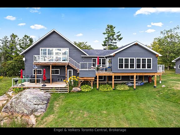 Direct waterfront property on Georgian Bay, full year round road access and year round 4 season renovated home. 220' waterfront with 2.2 acres. Large rocky outcroppings, large pine trees, and a due west facing lot (sunsets most nights). Oversized double car garage with a master suite on top (700 sq ft). Large post and beam Muskoka room with 14 foot ceilings (cathedral). Kitchen has granite counter tops, two sinks, and stainless appliances. Spacious dining area leads into good sized living room and generous foyer. Hardwood throughout and a fully finished 900 sq foot lower level, with two more bedrooms, 4 pc bathroom and large rec room. There is also a large detached workshop/garage, with a oversized garage door, finished storage areas, and workspace. The lot is level, with large rock outcroppings on the south side. Several decks and patios all face the lake, and an elevated hot tub to watch the world go by in. Excellent fishing is right at your doorstep and loads of wildlife to watch always ( deer, eagles, otters, beaver, osprey, swans, and all different kinds of other water birds.