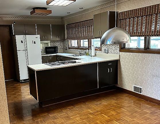 Brick patioBonus roomJenn air rangeCorian countertopsOff street parkingWet barBeamed ceiling