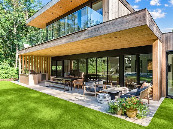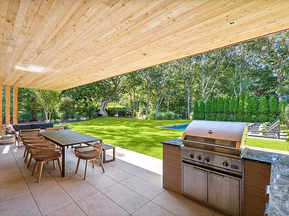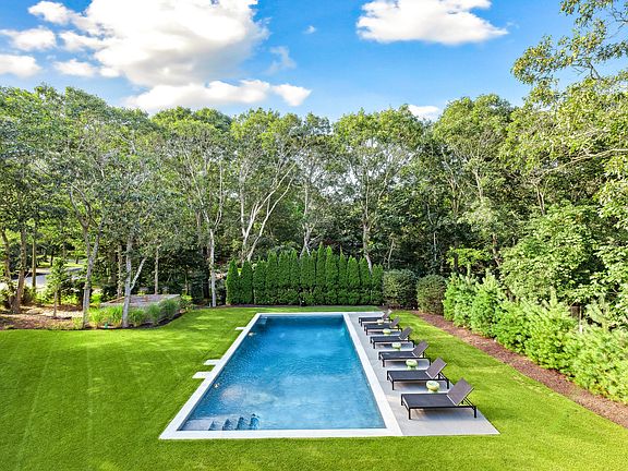 sq. ft. of living space, the spacious layout offers three distinct entertaining spaces; with a ground-floor primary and living space, separate guest quarters with its own living room and separate entrance, and a lower-level den with guest bedroom and office. When you enter, the gorgeous foyer is bathed in light from two-story, west-facing windows and showcases the stunning floating steel staircase with custom Siberian Elm stairs. From the foyer you'll find the main entertaining space with a state-of-the-art, professional, open-concept kitchen with stainless steel appliances and honed marble countertops. The dining and living area are crisp and clean with a wall of sliding glass door that leads you to a covered patio and outdoor kitchen. The backyard is lushly landscaped and the 38 x 18 heated Gunite pool with bluestone coping is sited for maximum sun. It is truly optimum for indoor-outdoor living. A private guest suite on the first floor with stunning views of the rear yard completes the main floor of the home. Beyond the mudroom, laundry, and powder room there is a separate, guest wing with its own entrance leading to a spacious den with clear cedar ceiling accents, exposed beams, and gas fireplace plus, two guest bedrooms share a full bath. This allows guests privacy just steps away from the main living area. Upstairs, two spacious ensuite bedrooms on opposite ends of the floor include the primary suite equipped with two walk-in closets and a private covered terrace with glass railings overlooking the rear grounds. The primary bath has a soaking tub, dual marble-topped vanity, private water closet, heated floors, and large shower. The finished lower level with 10' ceilings is flooded with natural light. A gracious ensuite guest room is separated behind a pocket door from the recreation area with stylish polished concrete floors, white oak accents, and a wet bar. The bucolic beachfront community of Hampton Waters offers amenities including exclusive use of a private white sand cove on Three Mile Harbor - the perfect location to watch sunrises, sunsets, sunrises, or the fireworks over the Harbor. [Rental Registration #24-172 ] THIS IS A TWO WEEK RENTAL-AVAILABLE AUGUST 17-SEPTEMBER 1.
