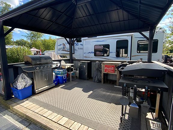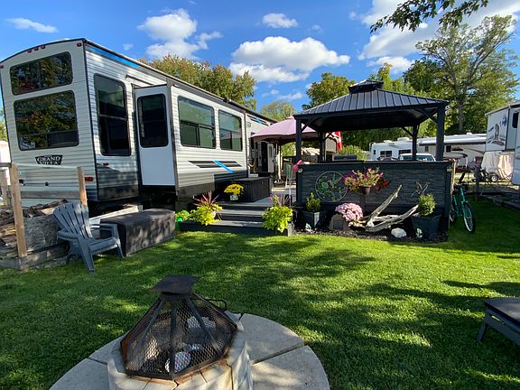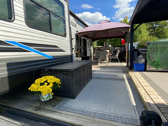 Welcome to 108 Boardwalk Ave, a Beautiful trailer home located on a canal that flows directly into the Trent River. Inside you'll find a cozy bedroom with a queen bed and built-in storage, along with two lofts that provide additional sleeping space for up to three guests. The bright, open concept eat-in kitchen and living room are filled with natural light, creating a warm and inviting atmosphere. Step outside to enjoy not one, but two spacious decks-one designed as a full outdoor kitchen and the other perfect for family meals and overlooks a pond. Completely turnkey, this property is ready for you to move in and start enjoying the relaxing trailer lifestyle. Like new 2022 Salem Grand Villa is 42' with a double loft. Seasonal Rate: Victoria Day weekend to Thanksgiving is $4210.00 (Includes sewer/water) Winter Storage: $300.00. Enjoy activities at the Rec Centre:Friday night Darts, Saturday night Bingo with long weekends Bingo both nights and Sunday night live bands.