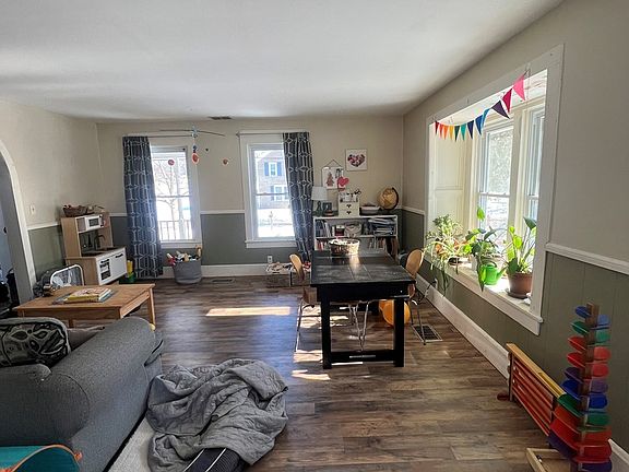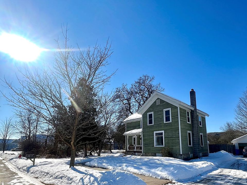 This home features 3 bedrooms and 1.5 baths. It's located on a quiet village street surrounded by trees. The home has ample living space downstairs, and 3 bedrooms with lots of storage upstairs. The master bedroom is spacious and includes a half bath. There is a charming front porch, and a lovely deck outback overlooking the yard. There's also a large two car detached garage and a wood shed.
