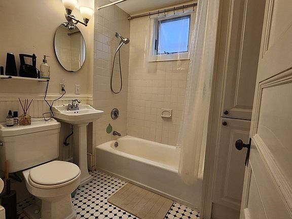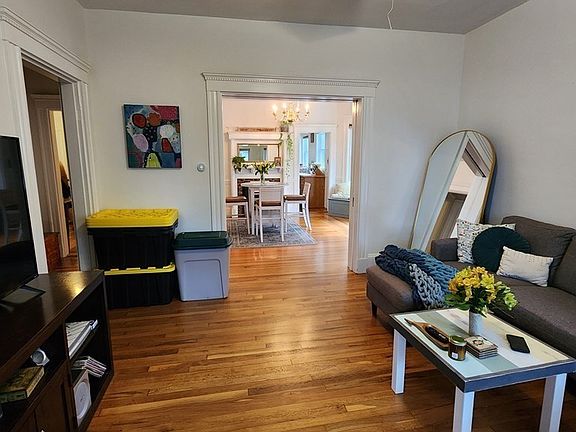 Beautiful and spacious apartment is located on the first floor of a lovely Victorian house. It includes: two spacious bedrooms; a large living room with pocket doors and bay windows, an even larger dining room, with a (non-working) fireplace/mantle, china cabinet, and bay windows, a modern eat-in-kitchen with a dishwasher, refrigerator, gas oven/stove, and pantry; and updated white tile bathroom. The apartment is in excellent condition and also features hardwood floors throughout, 9 foot ceilings, and detailed woodwork. Washer & dryer hook-up is located in the basement with lots of space for extra storage. Private side deck off of the kitchen. Additionally, there is a coin-operated washer and dryer in the basement. Includes 1 tandem off-street parking spot. A quick 7-to-10-minute walk to the Maxwells Green and School Street MBTA Green Line stops 2023-09-05