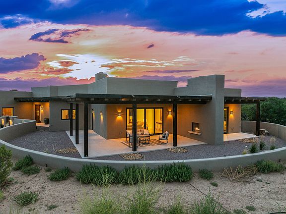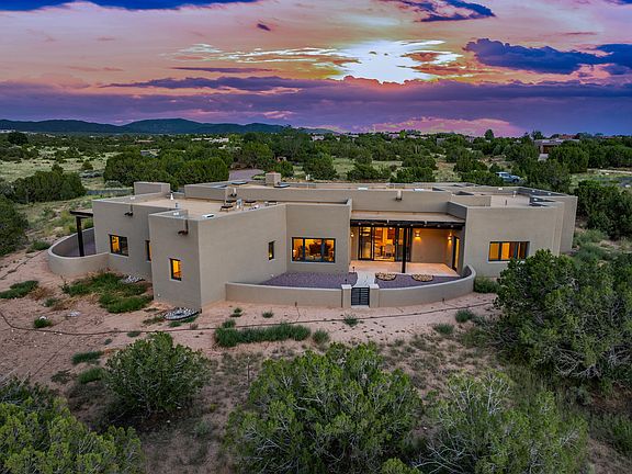 Just Completed New Custom Home in Estates I Las Campanas! This Contemporary Pueblo Style home has a timeless aesthetic with a unique blend of traditional and modern design elements. Enjoy excellent views of the Sangre de Cristo and Jemez Mountains and high end finishes throughout, including a Wolf Sub-Zero appliance package, custom Alder Wood doors, custom Alder Wood cabinetry, natural smooth trowelled plaster walls, stunning metal and wood beams, large format porcelain tile throughout, three fireplaces, extensive yard walls, extensive hardscaping and landscaping with rain water harvesting and drip irrigation system, built in radon mitigation system, in-floor radiant heating and recessed or wall mounted split cooling throughout, prewired for alarm and sound with Klipsch speakers installed.