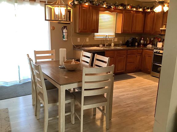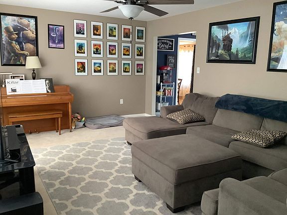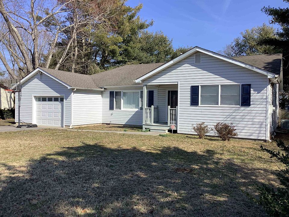 Contemporary Ranch on a quiet cul de sac street. Small front porch, Large formal living room, eat-in kitchen with sliders out to a rear deck overlooking a fenced back yard, Huge family room with dining room area. 3 bedrooms and one full bath. Small garage 9.6 deep x 17, 2 wide shed in the rear yard.