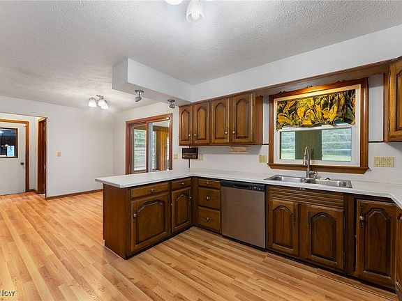 Upon entering, you'll find a spacious foyer with ceramic tile flooring. To the right is a large living room that connects to a formal dining room, perfect for entertaining. The kitchen boasts hardwood cabinets and floors, along with a convenient double-wide pantry cupboard and ample space for a dining table. A sliding glass door off the kitchen leads to an enclosed porch, offering a lovely extension of the living space. There is also a half bath conveniently located off the kitchen.