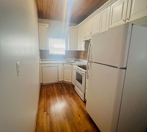 Apartment features two good-sized bedrooms, one with an attached half bath. Large living room with great light, galley kitchen with dishwasher, hardwood floors throughout. On-site laundry. Parking available for rent. Small pet friendly.