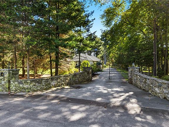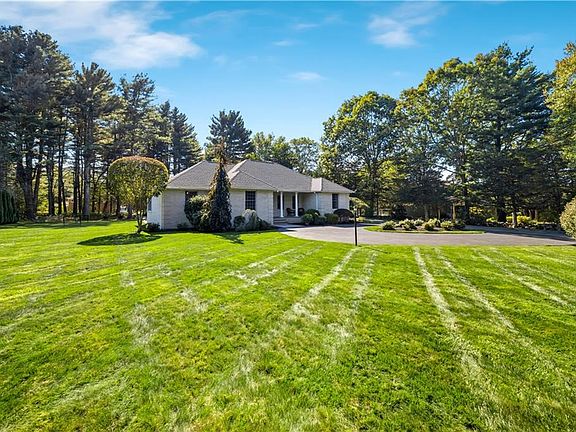 Situated on over 1 acre of meticulously manicured land, this stunning 3-bedroom, 2-bathroom ranch offers the perfect blend of elegance and functionality. A striking, custom gate welcomes you to this private oasis, where you'll find a beautifully crafted stone-front ranch, designed for effortless one-level living. As you step inside, you'll be greeted by an expansive open floor plan that features a central fireplace as the focal point of the spacious living room. Large windows and cathedral ceilings bath the space in natural light, creating a bright and welcoming atmosphere. The gourmet kitchen showcases high-quality cabinetry, offering both style and ample storage, complemented by stainless steel appliances. The kitchen flows seamlessly into the dining area, making it perfect for both family meals and entertaining. A separate office provides an ideal work-from-home space, while the sunroom/exercise room offers a peaceful retreat or fitness zone.The indulgent bathrooms are finished with luxurious details, offering a spa-like experience. Outside, the newly installed stone patio is perfect for alfresco dining and entertaining, and the hot tub is a serene spot to relax and enjoy the beautiful surroundings. Equipped with state-of-the-art smart home technology, this property offers convenience and control at your fingertips—from lighting to security. With its exceptional blend of luxury, privacy, and modern amenities, this home offers a lifestyle of comfort and sophistication.