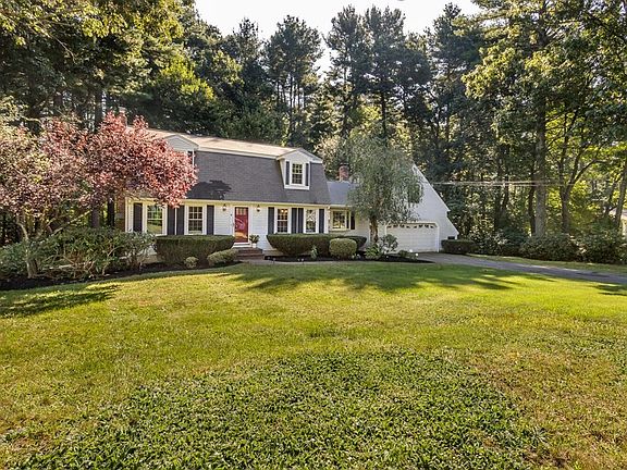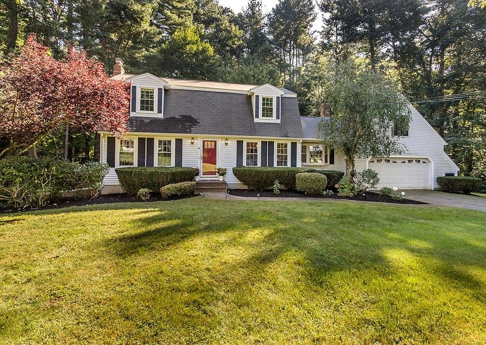 A stunning 3-bed Colonial Gambrel home on a cul-de-sac and backed by conservation land. The 1st floor includes hardwood floors, custom kitchen cabinets, island, and newer SS appliances. Living spaces include recessed lighting (wired for ceiling fan) and updated fireplaces. The bright/open 4-season sunroom boasts cathedral ceilings and skylight surrounded by sliding doors (option for expanded deck) overlooking the private yard. Fully renovated half bath w/ quartz counter. Upstairs features spacious primary BR w/ his/her closets, full bath w/updated shower. Lovingly maintained: electrical panel 2021, half bath 2020, SS appliances 2018, windows 2015, sunroom 2003. Located minutes to town center, train stops, Patriot Place. Don't miss this chance! Schedule a showing today!