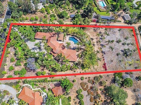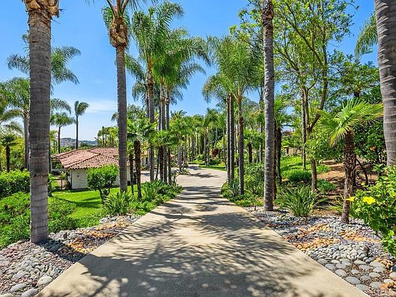 Tucked behind private gates in the prestigious, 24-hour guard-gated community of Rolling Hills Estates, this 4,596 est. sq.ft. Tuscan-style home offers resort-style living on 3.16 lush, equestrian-zoned acres. A dramatic rotunda entry leads to vaulted wood-beamed ceilings, rich wood-cased windows and doors, and expansive living spaces including a formal living room, great room with brick fireplace, and chef’s kitchen with granite island, WOLF range, Sub-Zero full-size fridge & freezer, and sophisticated brick accents. The private primary suite features backyard access, jetted tub, floor-to-ceiling tiled shower, dual vanities, and a custom walk-in closet. Two additional bedrooms offer ensuite baths, built-ins, and outdoor access. The interior also includes a full guest bath off the garage and a large laundry room with storage and sink. Outside, enjoy a west-facing Pebble Tec saltwater pool with rock waterfall, a fully upgraded covered patio with a new built-in BBQ and fridge, fireplace and lush grounds with over 200 palm trees, citrus and olive trees, and a full grass play area. A 4-car garage, new dual-zone A/C units, alarm system, and circular driveway complete the property. Community amenities include riding trails, horse stables, tennis & pickleball courts, lakes, and greenbelts. A rare blend of privacy, scale, and timeless design in one of Fallbrook’s most sought-after neighborhoods - this is more than a home, it's a lifestyle. Buyer and buyer’s agent to verify all in MLS prior to COE.