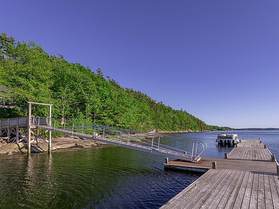 9 Rotunda Hill Road, situated dramatically above the Kennebec River, is an architectural delight. Pairing glass and stone this dramatic Georgetown estate is both contemporary and classic, designed to frame the expansive water views along 500+ feet of private frontage. The main level welcomes the outdoors in with soaring walls of windows, disappearing glass doors that open the house from end to end, and decks and porches from most rooms. A cozy library is a private space to unwind and rounds out the first floor perfectly. The tastefully appointed kitchen extends into a covered outdoor living and dining room for al fresco entertaining through the warmer months. The second floor is home to a private master suite, complete with spa like bathroom with soaking tub, separate laundry room, custom walk-in closet and covered deck. A true retreat, the master boasts both meadow views and the river meandering to the open ocean. The lower walk-out level thoughtfully offers two additional luxury suites and an entertainment room. Stunning hardscape and landscape embrace the cliff's edge, complete with a breathtaking horizon pool, hot tub and granite terrace. Patios and pathways marry the main home with a shingled 3 bedroom guest house, and there are two separate casitas offering luxurious and private guest accommodations, and could serve as a keeper's cottage. Included in the association is a wonderful wood beamed clubhouse and a deepwater dock awaiting your vessel. The Kennebec is known for some of the finest boating and fishing in the area, its scenic rock-rimmed shoreline brimming with snug coves and harbors. Boasting a less than three hour wheels-up to cocktails-on-the-terrace trip from New York or DC, Georgetown is just about an hour from Portland and its award winning arts and restaurant scene, and the jetport.