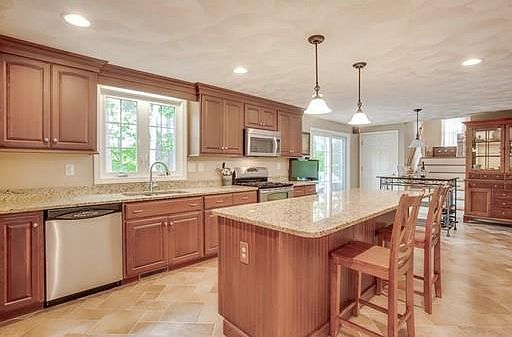 - Kit Dscrp: Countertops - Stone/Granite/Solid, Flooring - Stone/Ceramic Tile, Kitchen Island, Stainless Steel Appliances, Recessed Lighting, Slider, Lighting - Pendant