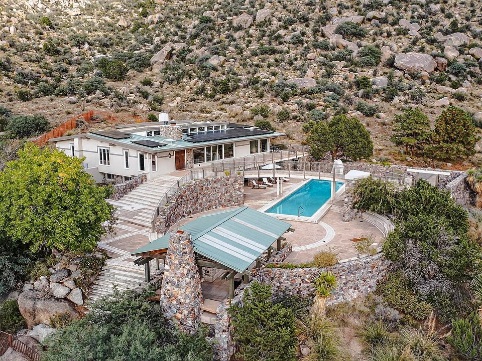 Elevate your lifestyle in this ''one-of-a-kind'' ABQ Dream Home! This authentic and refined mid-century modern home sits on an elevated double lot with 1.87 acres backing the Sandia mountains, bordering the Cibola National Forest and embodies the best of Albuquerque living. Expansive walls of glass frame breathtaking, unobstructed views of the mountains, vibrant sunsets, glittering city lights, starry nights, distant storms, and wildlife crossings. A stunning bridge and covered patio adorned by mosaic-tile cross over the shimmering pool leading to a massive outdoor covered cooking area with granite island, built in seating, and woodburning fireplace, creating a perfect blend of balance of timeless design and luxury living. Designed for both intimate gatherings and grand entertainment,