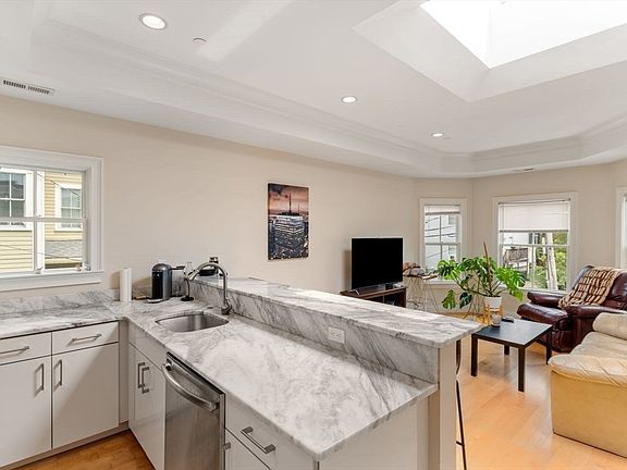 Available 9/1/2025. Tucked at the edge of charming Avon Hill, this sun-splashed top-floor two-bedroom, two-bath apartment offers both style and convenience. Step inside through your private entrance and be greeted by soaring ceilings, warm hardwood floors, and a dramatic skylight that pours in natural light. The open kitchen features granite countertops and stainless steel appliances, perfect for weeknight dinners or weekend entertaining. Central heat and air keep you comfortable year-round, while in-unit laundry and basement storage add everyday ease. Outside, a private back deck invites morning coffee or evening unwinding. With Porter and Davis Squares just minutes away - and Raymond and Danehy Parks at your doorstep - this home blends city living with neighborhood charm.