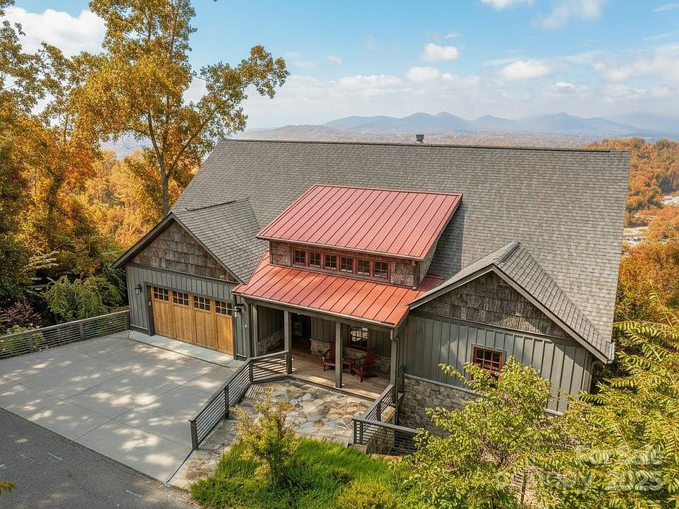 Enjoy panoramic 180-degree long-range & sunset mountain views just minutes to downtown Asheville. Easy and accessible main level living with three (of the four to five) bedrooms, no-step garage, laundry and a screened porch with a gas stone fireplace. Set the tone for effortless mountain life—morning coffee with pink skies, Mt. Pisgah rising thru the fog, golden-hour toasts, starry-night conversations. Open concept great room is made for gathering, framed by a vaulted ceilings inside and out, wood beams, and dark hardwood floors. The gourmet chef’s kitchen—with an oversized island and abundant storage—centers weekend brunch and easy weeknights. Wake to Mt. Pisgah in the main-floor primary suite; reset in a spa-like ensuite with dual vanities and a tile shower. The lower level offers a second bedroom suite, flexible fifth bedroom or office, a large family room with bar & covered deck. Plus, a ~500 sf bonus room for workouts, hobbies or theatre. Train display can remain or be removed. Gated Community. Floorplans included. Inquire about additional neighboring lots. DIRECTIONS: New Stock Rd > Weaverville Rd > Leisure Mtn Rd >Tranquil Forest Rd > Soaring Hawk View. GPS directions may be incorrect. No-short term rentals.