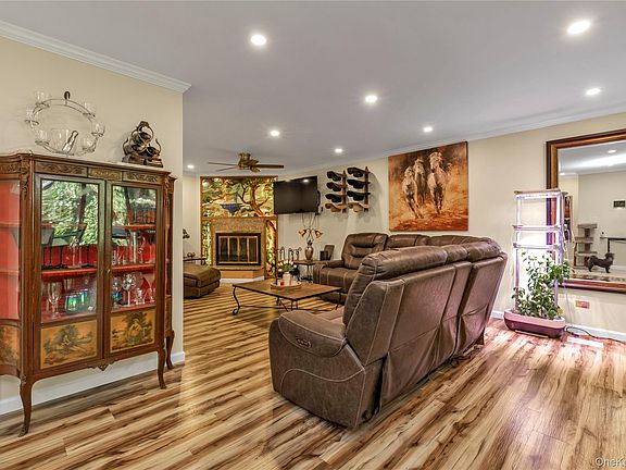 The home features a spacious open-concept layout with a sun-filled living room, fireplace, and double doors leading to a private patio—perfect for entertaining or relaxing. The gourmet kitchen is fully updated with custom cabinetry, quartz countertops, high-end stainless steel appliances, and a large island ideal for casual dining.