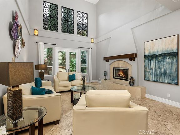 Upon entering through the beautiful courtyard, you'll be welcomed into a grand two-story circular foyer with a sweeping wraparound staircase. The formal living room boasts soaring vaulted ceilings, fireplace with wood beamed mantle, and French doors leading to a courtyard with a tranquil fountain. The elegant dining room is perfect for entertaining.