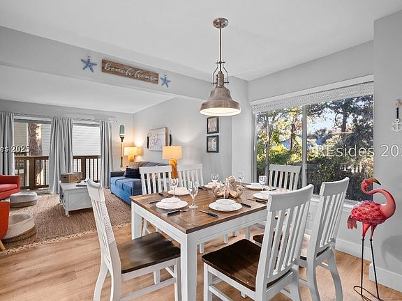 A short stroll to the ocean, this immaculately renovated end-unit Tanglewood features lagoon views from the back balcony and primary bedroom, a rare side-window alcove above the dining room, custom kitchen cabinetry, granite counters, two fully renovated bathrooms with aquamarine floor-to-ceiling backsplashes and penny pan tiling, contemporary furnishings, nautical-inspired decor, and zero-transition wide-plank LVP flooring. Tanglewood Villas feature a gated community pool and grill pits, and the complex is conveniently located within a 5-minute walk to Coligny Plaza, the iconic Tiki Hut and Pool Bar Jim's, and the brand-new Celebration Park. Lush tropical landscaping abounds, complimented by mature stands of towering live oaks and palmettos. Offered fully furnished and in pristine cosmetic and mechanical condition, this villa is primed to dominate the upcoming 2026 short-term rental season!