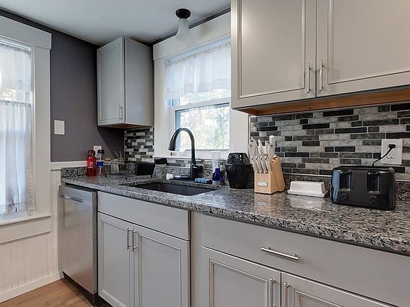 Brick fireplaceWood stove insertModern kitchenHorseshoe drivewayHardwood floorsCenter islandOff-street parking