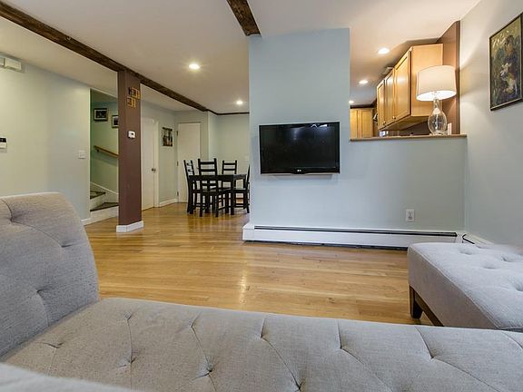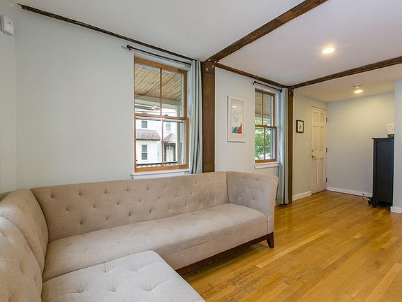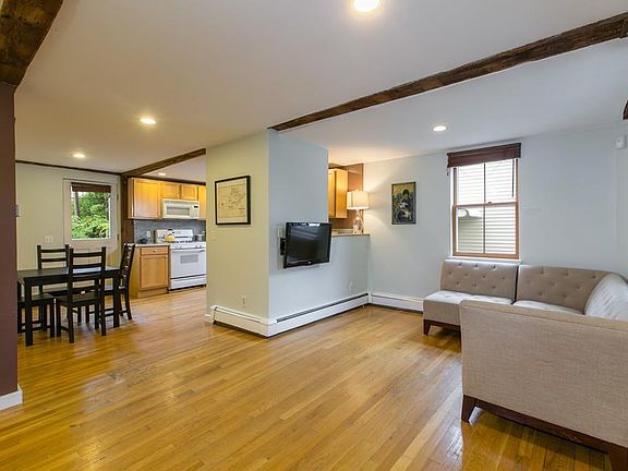 This sweet, historic TH condo feels like a single family. From the comfy front porch, the front door leads to an open-plan LR/DR/kitchen, w/windows on 3 sides and oak floors. The kitchen has grey-veined white quartz counters, glass tile backsplash, maple cabinets, ss fridge and dw, and a white stove. Off the kitchen is a hall closet, half bath, and door to the large, lush backyard and patio w/perimeter flowering perennials, shared with the attached TH. On the second fl is a small study area in the landing, 2 bedrooms, a full, tiled bath, and hall linen closet. Top fl offers bonus office/studio space with built-in recessed shelves on the stairway. Unfinished basement has ample room for laundry, storage, and workshop areas, w/door out to patio. All oak floors except tiled, full bath. Walk to Union Sq., winter and summer farmer's markets, restaurants, shops, dog park, several bus routes (CT2, 85, 88, 90), and 3 future Green Line stops. Easy access to MIT, Harvard, Tufts, highways, airport