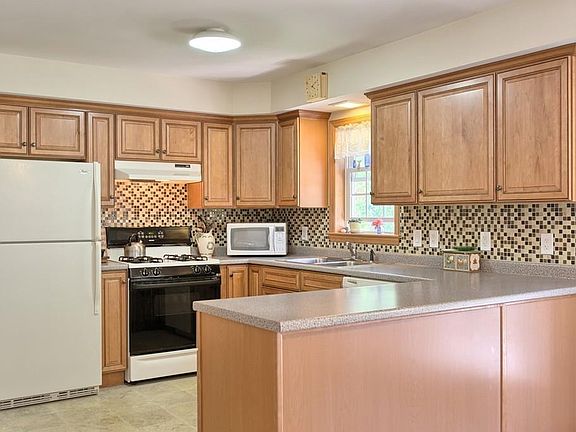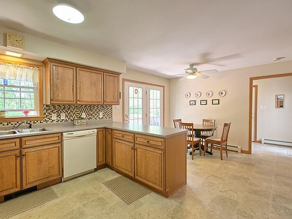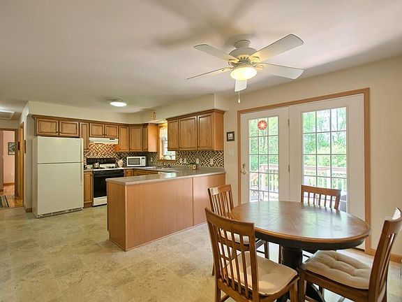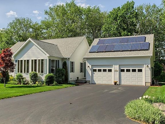 WELCOME HOME to this beautiful ranch. All you have to do is move in! The spacious living room with fireplace and hardwood floor great for entertaining opens into heated sun room. Sun room has wall of windows and ceramic tile floor. Enjoy cooking? Kitchen has plenty of counter space, breakfast bar and dining area. After dinner relax on deck with retractable awning overlooking tree lined back yard. Master bedroom has hardwood and ceiling fan. Second bedroom presently used as den/office. Home offers convenience of first floor laundry and interior access to two car garage. Solar panels are installed for savings. Grounds have sprinkler system,variety of flowers and blueberry bushes. Full basement has plenty of storage area, possible workshop or workout area. Home is nestled in nature setting but only minutes from major routes.
