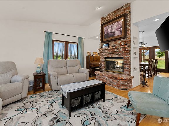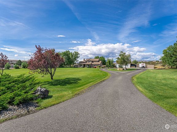 Lovely, gracious home on 5 acre view property. Welcoming w/main floor living/dining featuring two-sided fireplace, primary bedroom, ensuite full bath. Office is potential 5th bedroom. Walk-in pantry, utility/mud room w/back entry, and adjacent laundry room create an efficient flow. Three spacious upper bedrooms, one a primary w/full ensuite bath. A real bonus is the basement-perfect dedicated entertaining space! Beautiful mature landscaping including a mini orchard surrounds the home. Expansive back patio with pergola, hot tub, solar heated swimming pool. Entertaining paradise--truly your own backyard spa/resort property. 30' x 30' garage/shop with attached carport. Unique barn and pasture on the property with amazing equestrian potential.