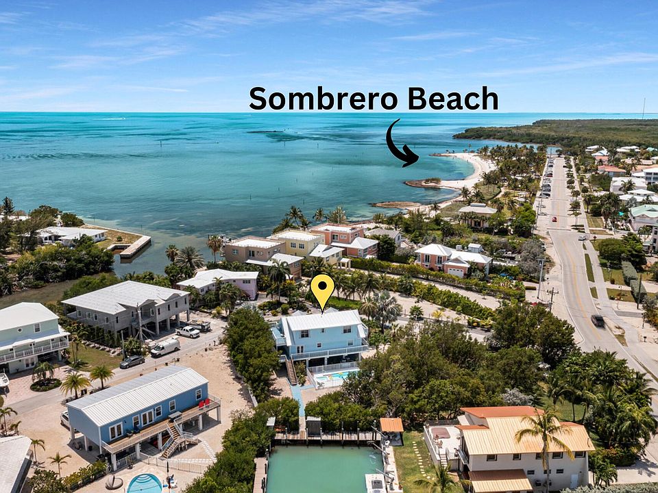 Uncover your coastal treasure with this spacious two-story home, situated on a massive 15,550 sq. ft. lot beside Sombrero Beach, offers both direct beach and ocean access via its 34 ft. dock, along with immediate rental income potential.Stroll back from the beach (just 0.1 miles away!) to discover a private, heated pool with a built-in spa and a shaded bar area that perfectly encapsulates outdoor living. The wrap-around deck leads from covered parking into a tiled, neutral living space featuring a granite kitchen with a sprawling peninsula bar that seats six. This level also includes two spacious bedrooms and a full bath. Upstairs, you'll find additional porches, two more bedrooms, and two bathrooms, including one ensuite. This investment oasis is secured by a newer roof (2020), durable Hardie board siding, and hurricane impact windows and doors. Ready to invest in one of Marathon's top spots and embrace beach life?