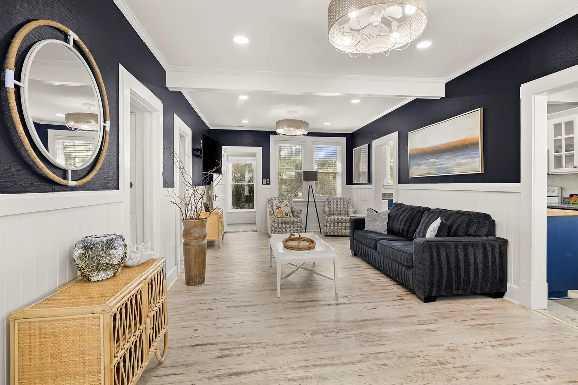 Sleek modern unitEpoxy floorsDesigned for beachy livingGleaming hardwood floorsEasy parkingCool industrial vibesAmple outdoor space