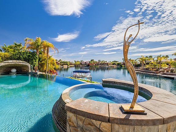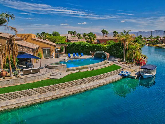 This home has an exceptional waterfront view in the highly desirable gated community of Santo Tomas community in Rancho Mirage California. Yes boat is included. 4 bedrooms and 4 bathrooms. Attached casita. Saltwater pool with grotto, waterfall & spa. BBQ. Fire pit. Wireless Internet, HOA fees, landscape maintenance, pool & spa maintenance + trash service are included. Tesla charging station in 2 car garage. This home is on the largest lot in the community and is located on a cul de sac. Contact agent for more information.