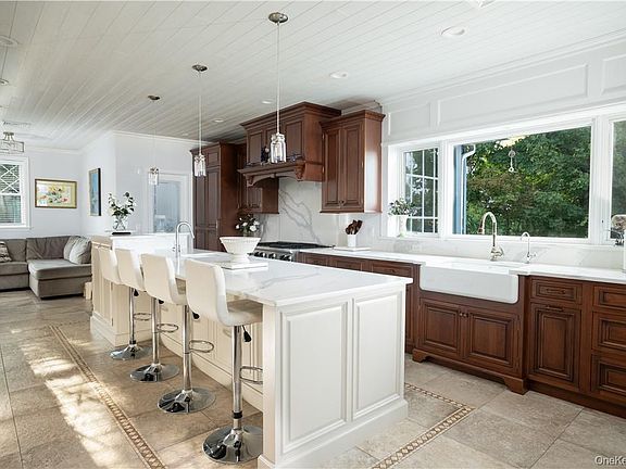 The new gourmet kitchen is a chef’s dream, equipped with premium appliances including a 48-inch Viking gas range, Thermador refrigerator, large pantry with a Frigidaire freezer, a porcelain farmhouse sink, and a double wall oven with convection, steam and rotisserie. The kitchen island features a drawer-style microwave and a vacuum sealer, paired with built-in cabinets and a large quartz countertop island that seats five.