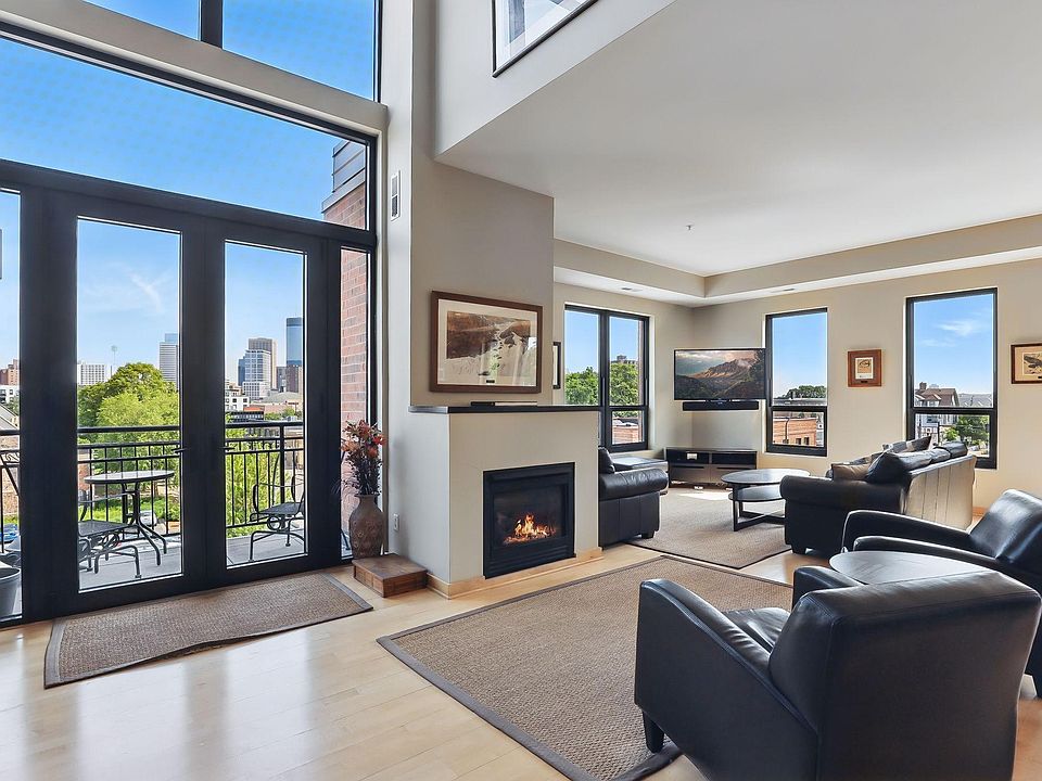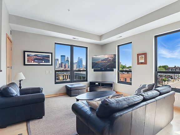 Greenleaf Lofts rare offering! Only unit like this! Coveted top floor 2 story corner unit with sweeping panoramic views of the downtown Minneapolis skyline! Floor to ceiling windows for natural light and cool city vibes! Open floor plan offer high ceilings, main floor 1/2 bath, gas fireplace, office space, storage nook, and spacious living and areas! Gourmet kitchen boasts a large center granite island for prep or entertaining. Stainless steel appliances and plenty of cabinet space for all of your cookware and spices! Upper level offers 2 large bedrooms – both with Shoji sliding 1/2 walls to open up or leave enclosed. The owner’s suite is spacious and sun-filled…corner bedroom banked with floor to ceiling windows. A 3/4 bath and large walk-in closet as well. 2nd bedroom has a large closet. Brand new carpet, 2025, stairs, and upper level in-unit stack washer and dryer. Awesome balcony overlooks downtown Minneapolis skyline…great spot to grill or chill! 2 assigned parking spaces - G17 underground heated parking & F8 covered assigned garage stall on back side of building on street level. All of the offerings of restaurants/shopping/theatres minutes away on Eat Street, downtown Minneapolis, and Uptown, plus the light rail is so close! Pet friendly building! Strong association! Greenleaf Lofts top floor corner 2 story condo lifestyle awaits!