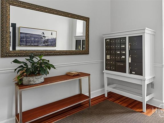 A rare opportunity to own one of the most distinctive loft apartments in the historic Lindsay & Morgan Building. This property boasts an exceptional location just off Wright Square, complemented by its exquisitely designed interior. Upon entering the building, you are welcomed into a bright, gallery-style entrance foyer, adorned with elegant moldings, hardwood floors, and captivating artwork. Residents and guests have convenient access to an elevator located near the mid-first floor, while a separate freight elevator is available for moving large items. Both elevators serve all levels, from the basement to the fourth floor. Stepping into the unit, you are immediately enveloped by an abundance of natural light streaming from the front to the back of the interior, accentuating the soaring ceilings and uniquely architecturally designed rounded walls. Hardwood flooring extends throughout almost the entire interior, adding to its charm. The gourmet kitchen, a true chef's delight, features a central island and all the modern amenities one would expect, serving as a natural focal point for gatherings and entertaining. The thoughtful blend of concrete and hard-surface countertops, along with the original iron and glass window, further highlights the meticulous attention to detail in this property's interior finishes. Additionally, the unit offers a breathtaking view overlooking Oglethorpe Avenue, with the steeple of the Independent Presbyterian Church providing a picturesque backdrop. The full bath features a built-in tub within the shower, enclosed by glass doors, and a built-in corner cabinet for additional storage. If the interior isn't enough, the fourth floor of the building offers an outdoor deck for residents and their guests to relax and enjoy, offering beautiful sunset views to the west and a distant view of the City Hall gold dome to the north. This unit is also one of only 7 with an assigned parking space in the attached garage. It also includes a large private storage area on the basement level. Don't miss the chance to own this near-perfect pied-à-terre and enjoy one of the best locations within the Landmark Historic District.