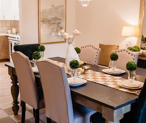 Updated kitchen featuring stone countertops, stainless steel appliances, custom cabinetry & breakfast nook