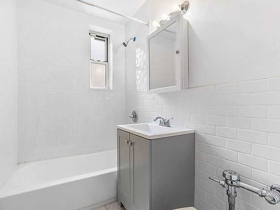 The bathroom is clean, bright, and just finished remodeling with new white subway tiling. It also has exceptional storage, including a mirrored medicine cabinet and storage under the sink.