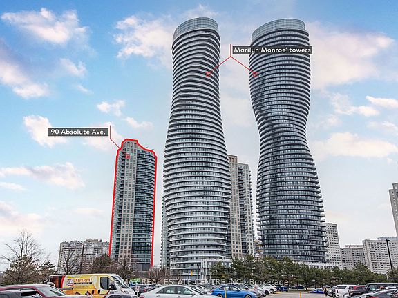 Welcome to this classically elegant Lower Penthouse in the iconic Absolute Condos, also known as the Marilyn Monroe Towers. Enjoy soaring 10 ft ceilings, crown mouldings, and laminate flooring throughout this spacious 2 plus 1 bedroom suite. The den with French doors functions perfectly as a third bedroom or home office. The stylish kitchen features granite countertops and stainless steel appliances. The primary bedroom offers a five-piece ensuite and walk-in closet, while both bathrooms feature marble floors and glass showers. Step out onto the large balcony with two walkouts and take in stunning southwest views of the lake and downtown Mississauga. Includes one parking space, two lockers, and access to premium amenities including indoor and outdoor pools, a gym, and more. Perfect for first time home buyers or investors!! If you are looking for big space with less down payment this is your best bet where luxury meets practical and functional layout!! Freshly painted!! Beautiful views of celebration square!!A must must see!!!