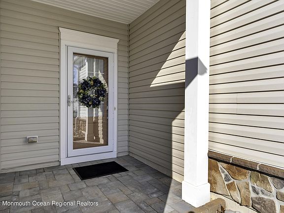 Welcome to this beautiful Abbeyville model on a professionally landscaped, premium lot. Enjoy the privacy of a wooded yard from the spacious 10' x 29' custom patio. Home has all hardwood floors. Direct access from the two-car garage to a mudroom which has a closet and custom built in furniture. French doors open to a spacious library with crown molding upgrades and wainscoting package. The gourmet kitchen has rich cherry cabinetry, leathered granite counters, stainless appliances and tumbled marble backsplash. Additionally, it has a large island with additional seating. Overlooking the kitchen is the Great Room with a marble surround gas fireplace and wood trim enhancements. Home has gutter guards and maintenance agreements with Terminix and Toms River Heating and Air Conditioning Co