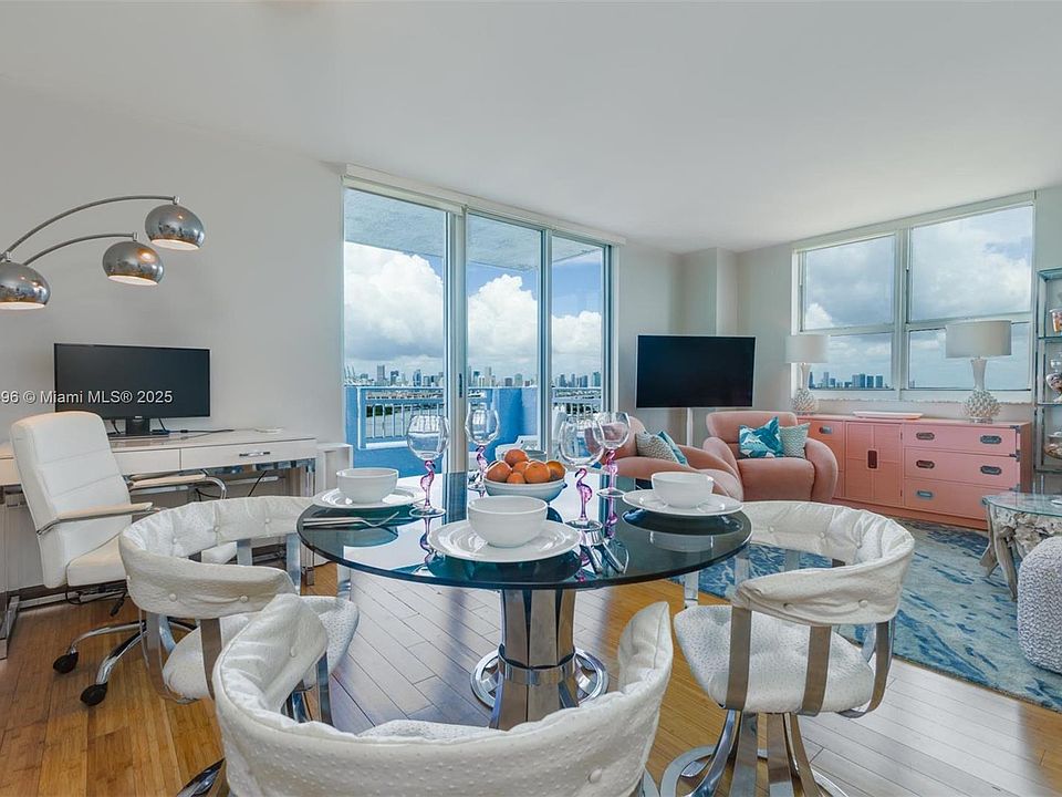 Stylish vintage touchesCorner residenceFisher islandDowntown skylineMiami beach marinaPool deck with bbqVibrant furniture