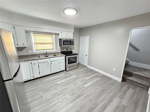 MOVE-IN READY! 3 bed 1 bath Cape Cod. Resilient flooring, fresh paint, new lighting fixtures, and an enclosed front porch. Kitchen with new appliances! Updated first floor bath. Vinyl thermal windows, new doors, and a newer tear off roof within 5 years! Hookups for W/D in basement. Opportunity for a finished bonus space in the attic!