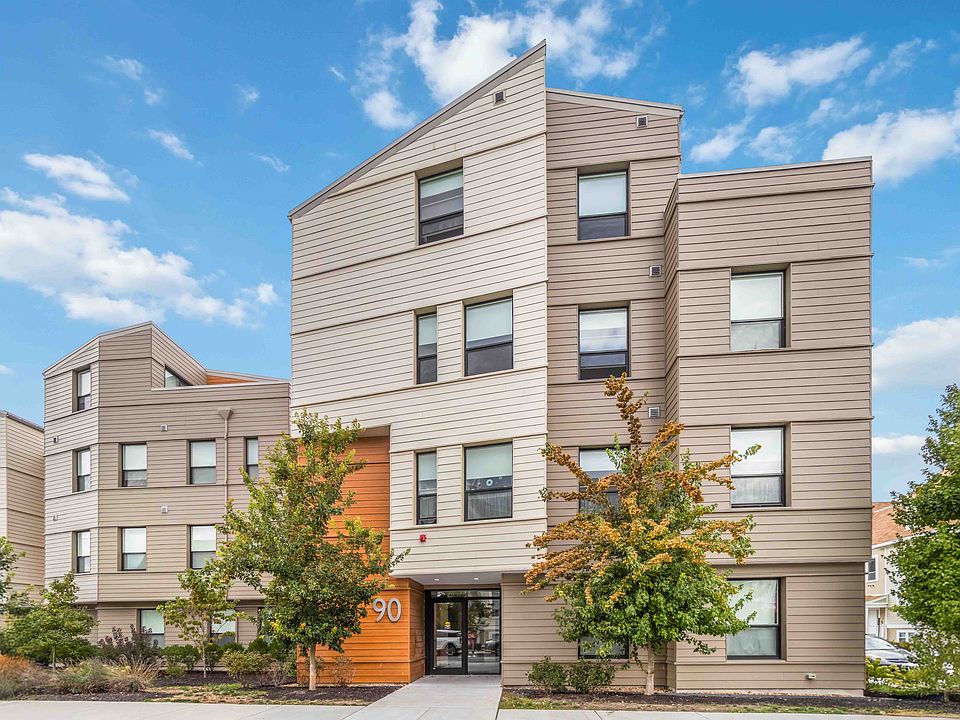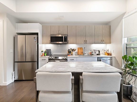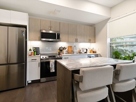 Welcome to 90 Antwerp an elevator-accessible, LEED Certifiable condominium in one of Brighton's most convenient locations, just minutes from Boston Landing, the Charles River, and the Green Line. This stylish second-floor home features an open-concept layout with tall ceilings, oversized windows, and wide-plank hardwood floors that fill the space with natural light. The modern kitchen offers sleek cabinetry, quartz countertops, a marble-look island with seating, and stainless steel appliances. The bright living area is perfect for relaxing or entertaining. Both bedrooms are generously sized, and the baths feature modern vanities and designer finishes, including a tiled walk-in shower. Additional highlights include in-unit laundry, central heat & A/C, covered parking, and a 900 sq ft amenity room. Built for comfort and efficiency, this development offers eco-friendly materials and an inviting corner park for outdoor enjoyment. ONLY 1st month's rent and security deposit required!