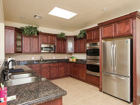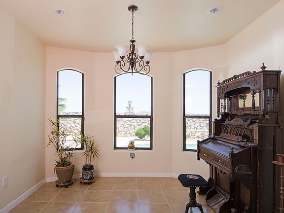 Tired of the heat? Just in time; enjoy the refreshing in-ground swimming pool in this 2009 Southwest-Contemporary style home. The front entry greets it's guest w/a gated courtyard, perfect for potted plants & décor. After entering through the glass accent front door your eyes are captured by the towering great room ceiling with accent beams. The great room features a built-in speaker system & a conveniently located wet bar equipped w/drink cooler & sink. Great room designed w/built-in shelving on both sides of fireplace w/ornate wooden mantel. You'll love the dark cherry wood cabinetry, granite countertops & use of ceramic tile throughout this fine home. The stainless steel appliances include a convection oven/microwave & 5 burner gas range. Cozy up to the fireplace in the master bedroom on cold winter nights. The views from the backyard are amazing & there are no backyard neighbors, so enjoy your privacy! Refrigerated air, water softener, xeriscaped yard w/irrigation system & heated swimming pool.