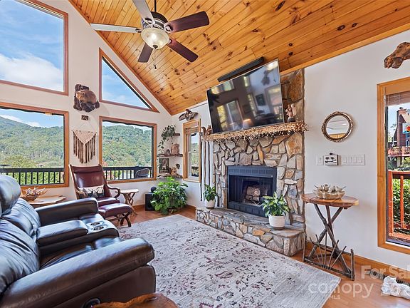 Welcome to 90 Appalachian Trail, a soul-stirring retreat with unforgettable views only 7 minutes to the heart of Maggie Valley, or 15 minutes to downtown Waynesville! This contractor maintained and thoughtfully upgraded 2bd/2ba cabin is being sold fully furnished, and features main-level living, including a spacious primary suite, open-concept living and dining area, natural oak flooring, and a beautifully upgraded kitchen with 2025 quartz countertops. Other recent upgrades include a 2025 roof featuring seamless gutters with leaf guards, 2020 4 zone mini-split system, 2025 range, and brand new carpeting upstairs. From the moment you step through the front door, you’re welcomed by the warmth of the rustic stone fireplace, and surrounded by natural light from the expansive wall of windows. Enjoy unobstructed, year-round mountain views while watching the ever-changing scenery and wildlife from the cozy indoors, or from the comfort of the freshly-stained wraparound deck complete with custom retractable and LED lit awnings. Upstairs, you’ll find a flexible loft space perfect for an office space hosting dream like work-from-home views, as well as a guest room with en suite bath offering privacy and comfort to your visitors. A pollinator’s paradise, the property is surrounded by mature landscaping and show-stopping perennial flower beds (hydrangea, peony, fire bush, butterfly bush) offering beauty throughout the seasons. Well-maintained roads and easy year-round driveway access provide peace of mind over the winter months. There is a storage building outside, and the hand-dug basement/crawlspace means there's no lack of storage. Central to the shops and restaurants of Maggie Valley and Waynesville, Cataloochee Ski Area, Blue Ridge Pkwy, Great Smoky Mountains National Park, Harrah’s Casino and just over 30 minutes to Asheville. Whether you’re looking for a full-time residence, a peaceful mountain escape, or an income producing vacation rental, 90 Appalachian Trail offers the best of mountain cabin living. Call today for your private showing!