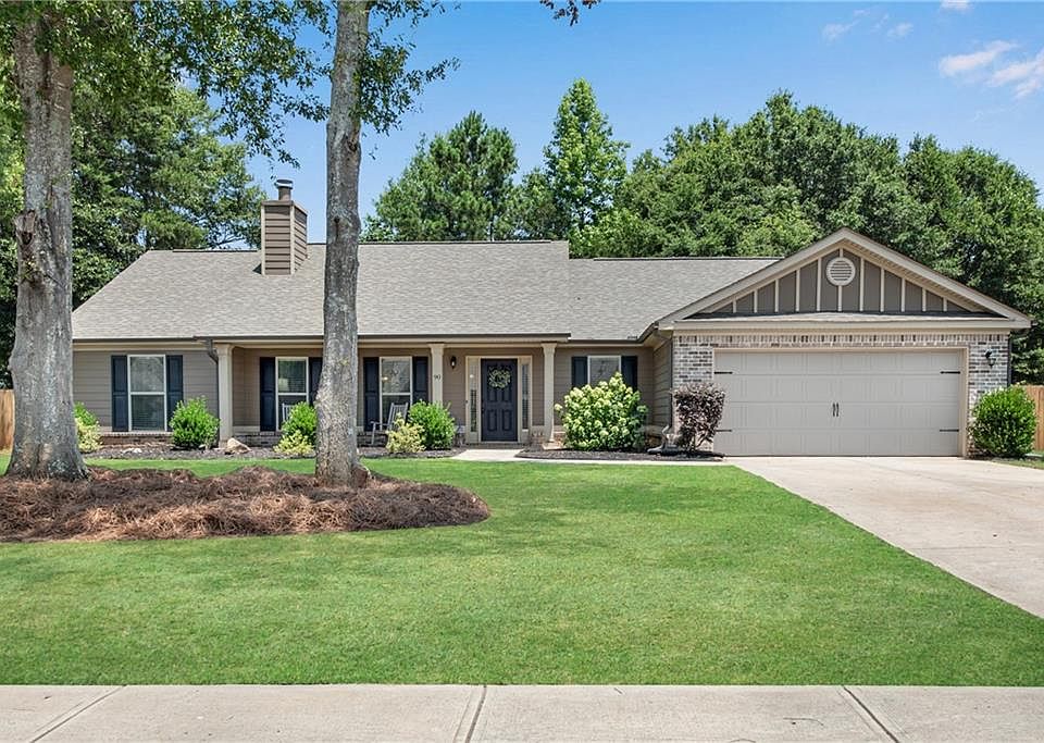 Must see this incredible private level wooded farmhouse style ranch, with three bed and three bath including a bonus/office room. Covered front with brick and concrete siding, attached two car garage facing the front and long driveway. Open floor plan with large vaulted great room, custom built bookcases/shelving, brick fireplace, and a view to the kitchen. This spacious kitchen features a large center island with granite countertops, tile backsplash, custom built white cabinets, and open to the dining room and great room – great for entertaining! Dining room with wainscotting and tray ceilings and natural lighting throughout the home. Spacious walk-in laundry room with window. Oversized master with sitting area and double tray ceilings. Elegant master bath with separate his and her sinks, separate soaking tub and shower, custom cabinets, and large walk-in closet. Split bedroom plan with large secondary bedrooms and bonus room that could be utilized as an office space, game room, etc. Covered back porch with large private yard, wooded fence, incredible outdoor living! Located near parks, shopping, and schools.