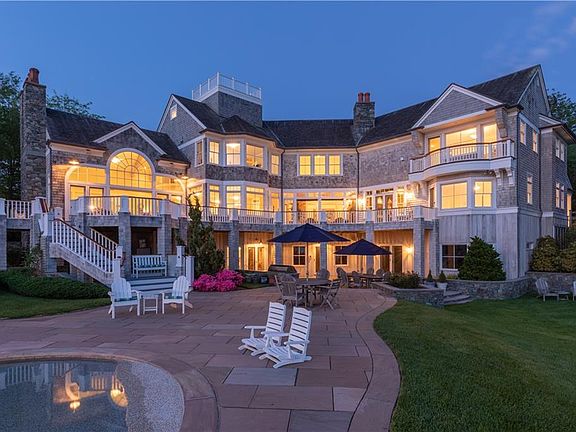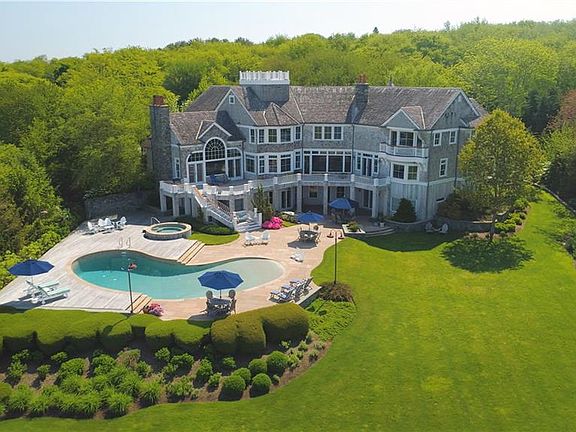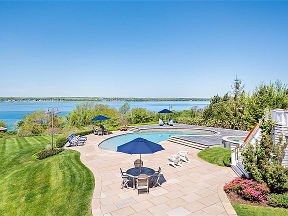 Coastal perfection! This waterfront estate, beautifully sited on the shore of Jamestown, overlooks scenic Narragansett Bay. A private winding lane leads to the 3.7 acre property with colorful coastal gardens, manicured lawns and stone walls. This unique, classically inspired, architecturally designed, shingle style home is highlighted by a beach-entry, waterside pool and a gorgeous outdoor entertainment space with full kitchen. A grass path leads to a water's edge dining gazebo, beach and mooring. A sun-lit interior offers dramatic water views with an open floor plan. Main floor rooms include: a custom eat-in kitchen, with large pantry, that opens to a 2 story family room showcasing a floor to ceiling stone fireplace and reclaimed wooden barn beams, an elegant dining room, butler's pantry, cozy library, and an ensuite bedroom with sprawling spa bath and deck access. The lower entertaining level has something for everyone: an expansive pub game room, a cabana with steam shower, an artist studio and an office - all with direct access to the outdoor entertaining space. Several additional guest bedroom suites make this home the perfect choice for multi-generational family living and family/friend gatherings. A rooftop widow's walk that offers views from Block Island to Providence, in addition to the 3 stop elevator and a 3 car garage, make this waterfront home a rare gem!