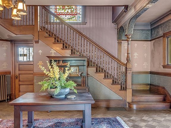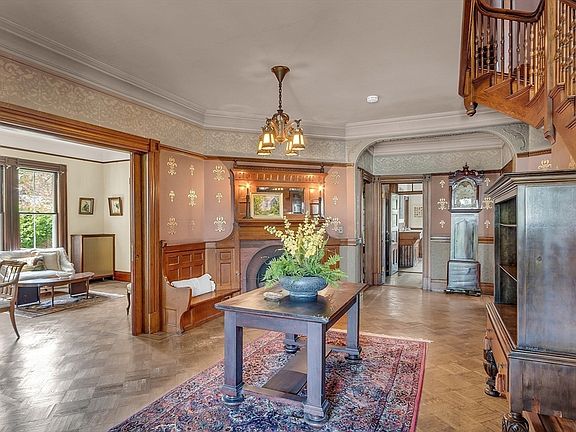 The grandeur of this 1889 Victorian residence is nothing short of breathtaking. Its architecture melds Shingle style with a Queen Anne turret, enriched by a robust Richardsonian Romanesque influence.The owner has staunchly safeguarded and preserved its original details—from the wallpaper and plaster castings to the intricately carved woodwork. Positioned on Doctor’s Row along the majestic Bellevue Avenue, this home now seeks a new custodian to return it to its former splendor. The foyer delivers a stunning first impression, crowned by a stained-glass window atop the grand staircase; note the buttressed plaster details framing the area, the corner fireplace complete with a welcoming wood bench, the original wallpaper, and mahogany inlays that edge the parquet floors. Candidly, this house requires significant restoration. Yet, for those passionate about revitalizing history, it offers an unmatched opportunity. This investment is a testament to the craftsmanship of a bygone era.
