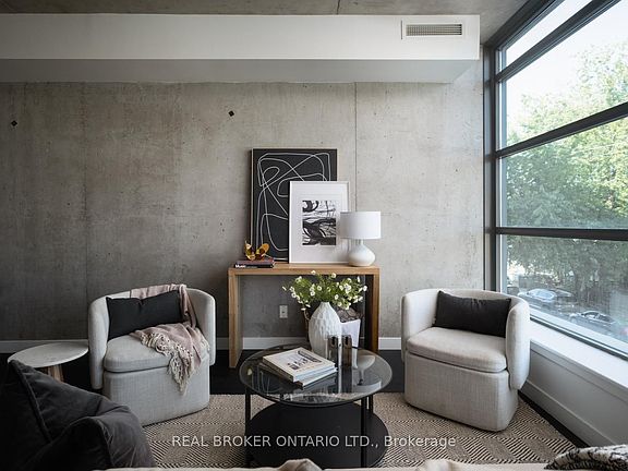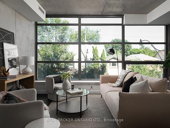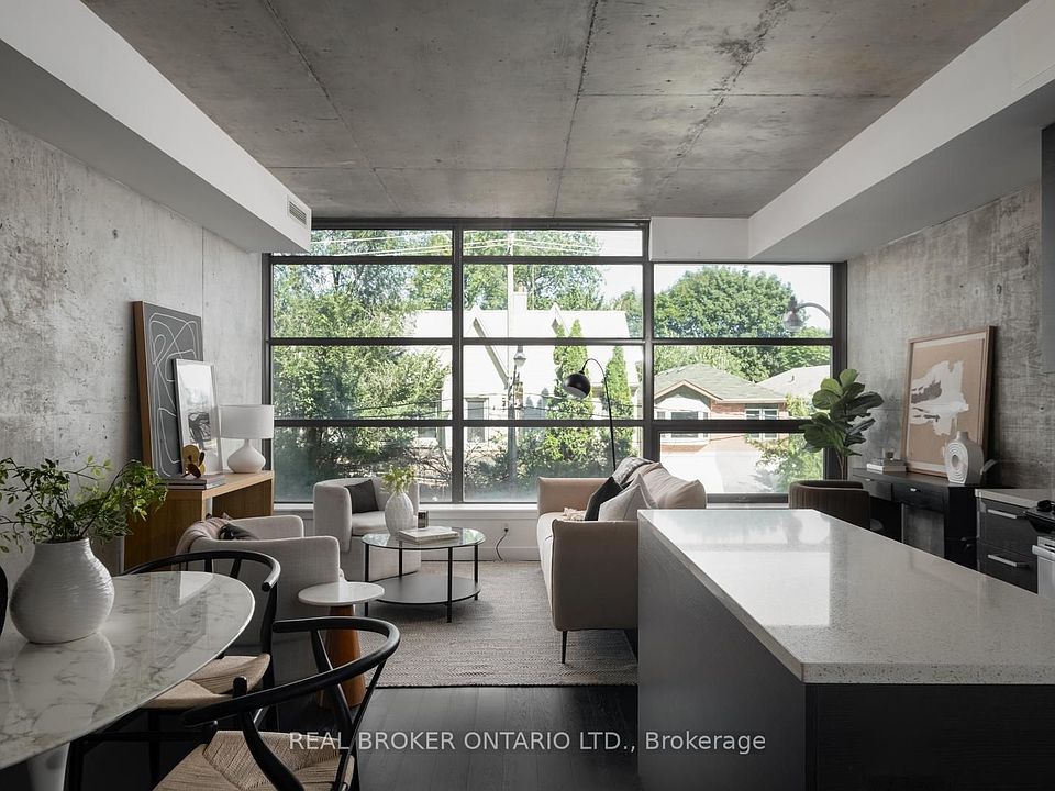 Welcome to The Ninety where modern design meets loft style living. This stylish 1+den suite features exposed concrete walls and ceilings, hardwood floors, stainless steel appliances and a functional open layout. The spacious den can easily serve as a second bedroom or home office, while the living rooms wall-to-wall windows immerse the space in natural light, creating a bright and airy feel. The Ninety is one of Torontos most sought-after boutique loft residences, blending historic character with contemporary finishes and offering amenities like a courtyard terrace, party room, and concierge. Perfectly situated in the vibrant Riverside/Leslieville neighbourhood, you're just steps from Queen Street East's cafés, restaurants, shops, parks, and trails, with easy access to transit and major highways. Unit 202 delivers the ideal combination of style, function, and location.