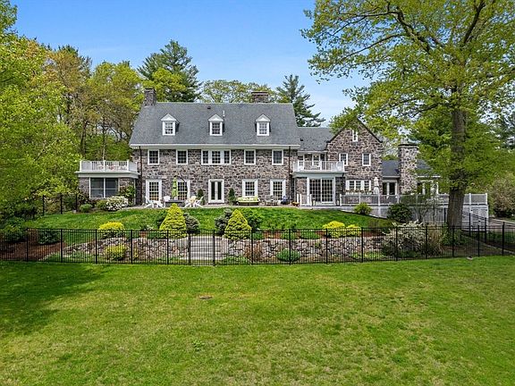 New Price! A rare opportunity to own a home that blends historic grandeur with the comfort and grace of modern living. This 1913 stone manor is nestled on a picturesque cul-de-sac in a prime Needham location, abutting over 17 acres of conservation land & enjoying direct access to the Charles River. Over 7500sqft of renovated living space includes 6 fireplaces, stone sunroom with floor to ceilings windows, gourmet kitchen, finished basement, 3 car garage & an abundance of storage. The 2nd floor hosts the primary suite equipped with a fireplace, dressing area & custom closeting. An oversized laundry room & 2 large additional bedrooms with a shared bath complete the second level. Two additional gracious bedrooms & a full bath are on the 3rd floor. There are multiple balconies, oversized back deck & patio with a built-in fire pit & hot tub to enjoy the majestic sweeping vista. This remarkable property offers rare character, space & setting. They just don't make them like this anymore!