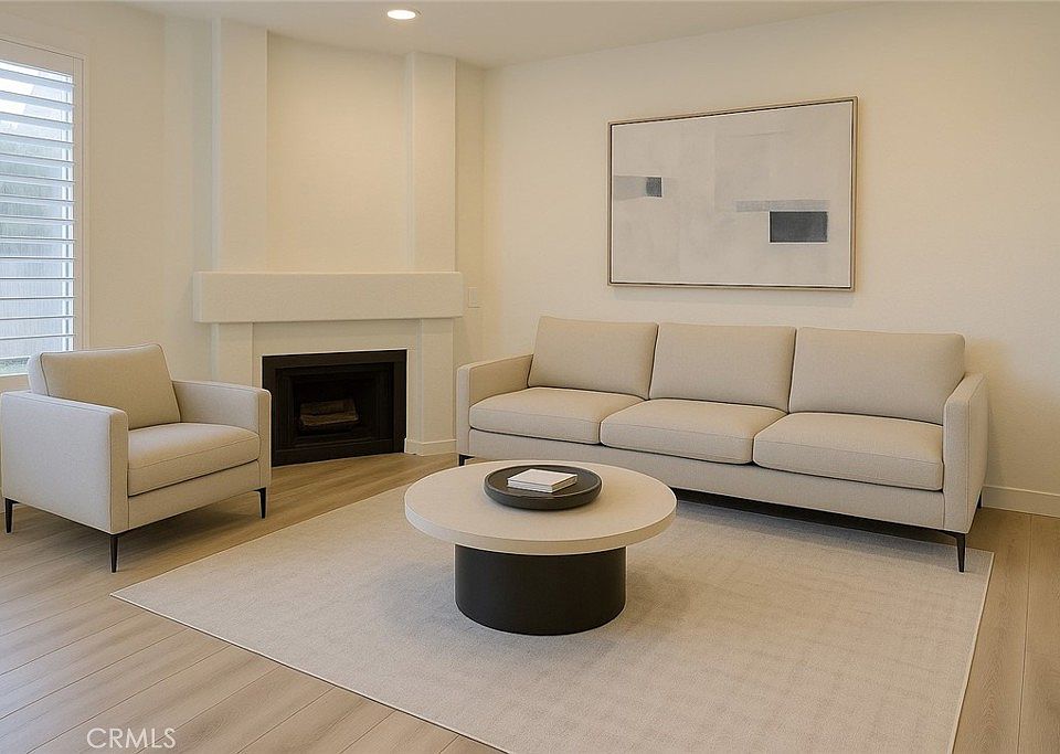 The main level features a bright and airy living room with a cozy fireplace, a remodeled kitchen with granite countertops, an in-unit laundry area, a guest powder room, and a private enclosed patio—perfect for relaxing or entertaining.